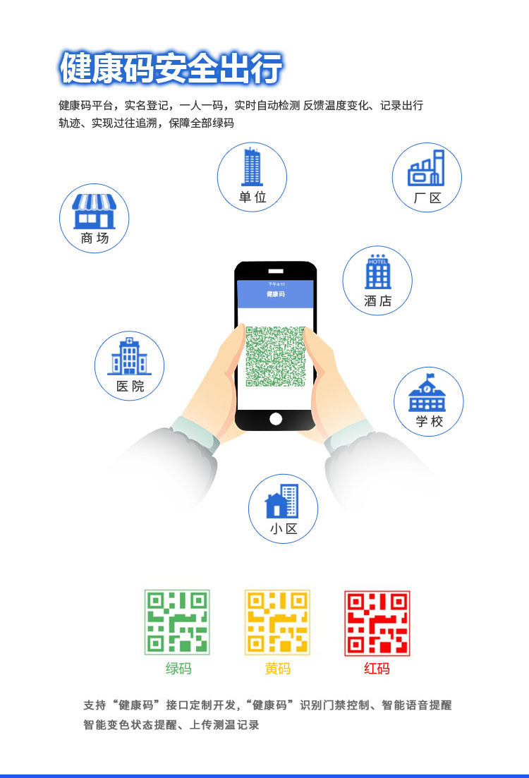 當F6-FH刷臉測溫掃碼一體機對接了健康碼平臺后(由國家政務服務平臺提供健康碼接口),一體機可以實現健康碼自動驗證功能,通過人員比對的通行人員(無需摘口罩即可完成人臉識別測溫),系統自動分析健康碼的狀態,如果健康碼異常(黃碼/紅碼)就會自動發出健康碼異常的告警,并自動生成體溫考勤記錄、數據統計分析及報表(可導出),第一時間形成測溫和健康碼大數據,可以更好地協助政府做好防疫管控。