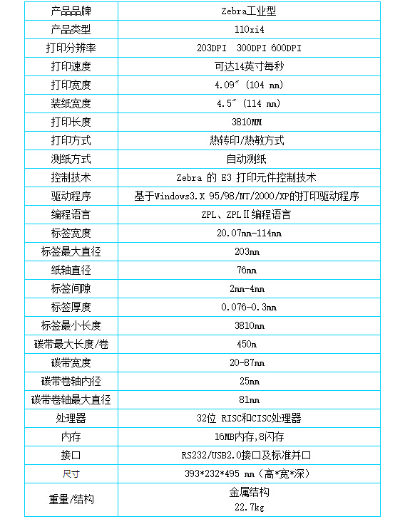 Zebra 110Xi4(300dpi),打印方法:熱轉印打印或熱敏打印,32 位 133 Mhz RISC 處理器,8 MB 閃存:包括 2.0 MB 用戶可用的非易失性內存存儲控件,用于存儲可下載內容,內置實時時鐘,高級標簽/介質計數器,自動校準:打印機在啟動時或打印頭使用約 2 個標簽閉合時會自動校準,預提醒系統:通過前面板和 ZebraLink 警告發出標簽/碳帶不足或清理打印頭的提醒,全新的多功能前面板和多語言寬屏黑白 LCD 顯示器 —具有用戶可編程密碼保護功能,透明的介質側門——無需打開打印機系統,即可輕松監視耗材使用情況,帶有 E3? Element Energy Control 的薄膜打印頭,有利于實現卓越的打印品質,具備自動檢測功能的串行 RS-232 和雙向并行端口,雙介質傳感器:發射型和反射式,可通過軟件或前面板選擇。