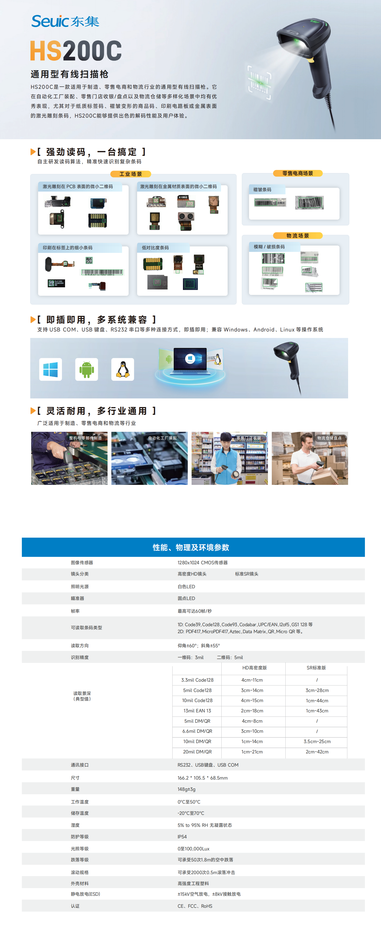 HS200C是一款適用于制造、零售電商和物流行業的通用型有線掃描槍。它在自動化工廠裝配、零售門店收銀/盤點以及物流倉儲等多樣化場景中均有優秀表現,尤其對于紙質標簽碼、褶皺變形的商品碼、印刷電路板或金屬表面的激光雕刻...