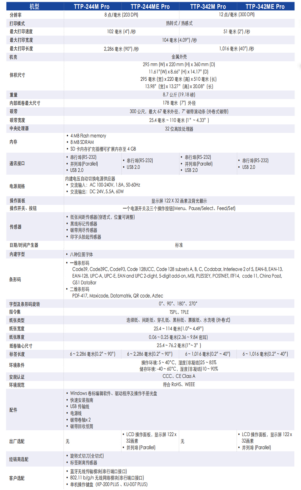 TSC TTP-342M Pro是一部經濟實用的入門級工業型條碼列印機。4英吋列印寬度、300 dpi解析度、每秒2英吋列印速度,適用于小標簽、低印量之各式應用。鐵制外殼搭配透明視窗,除了穩定耐用,同時方便使用者即時掌握碳帶及紙張的使用情形。