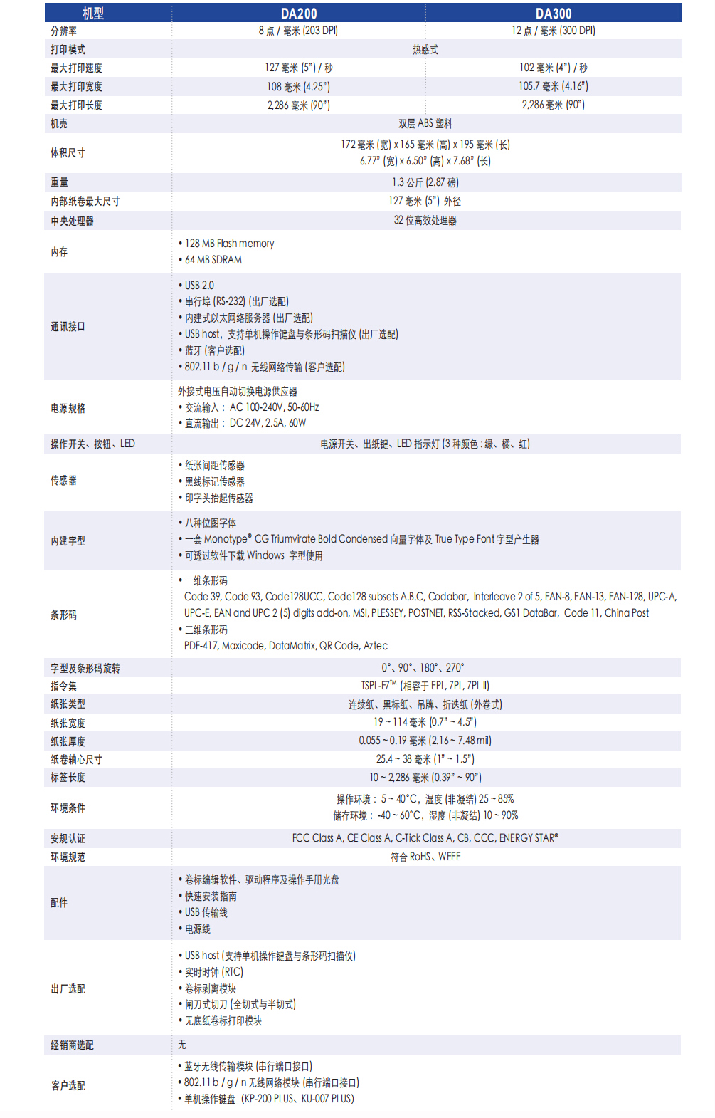 DA200系列印表機結合了耐用穩定的特性,同時滿足客戶的成本考量。DA200系列提供203與300 dpi兩種版本,列印速度最高可達每秒6英吋,透過60瓦特的電源供應器達成高品質的標簽列印。