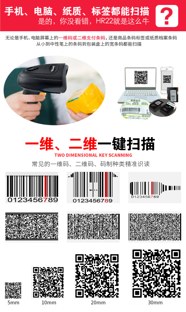 無線藍(lán)牙掃碼槍 藥店超市商場收銀掃描器 醫(yī)院醫(yī)保健康碼掃碼器 hr22-bt 無線一二維掃碼槍 高精度掃描快捷解碼。適用于商超零售商品碼/手機(jī)付款碼掃碼收銀/醫(yī)院藥店服務(wù)臺(tái)電子碼查詢/醫(yī)院電子健康卡掃碼查詢。