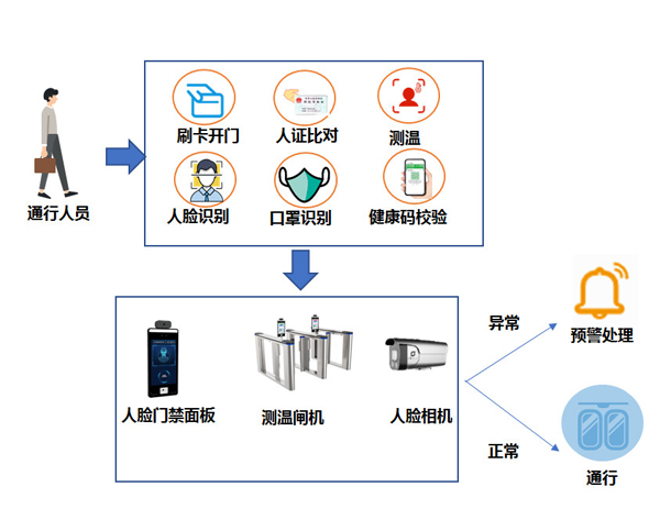 (1)人員通行健康碼、測溫、人臉等自由組合認證進出。